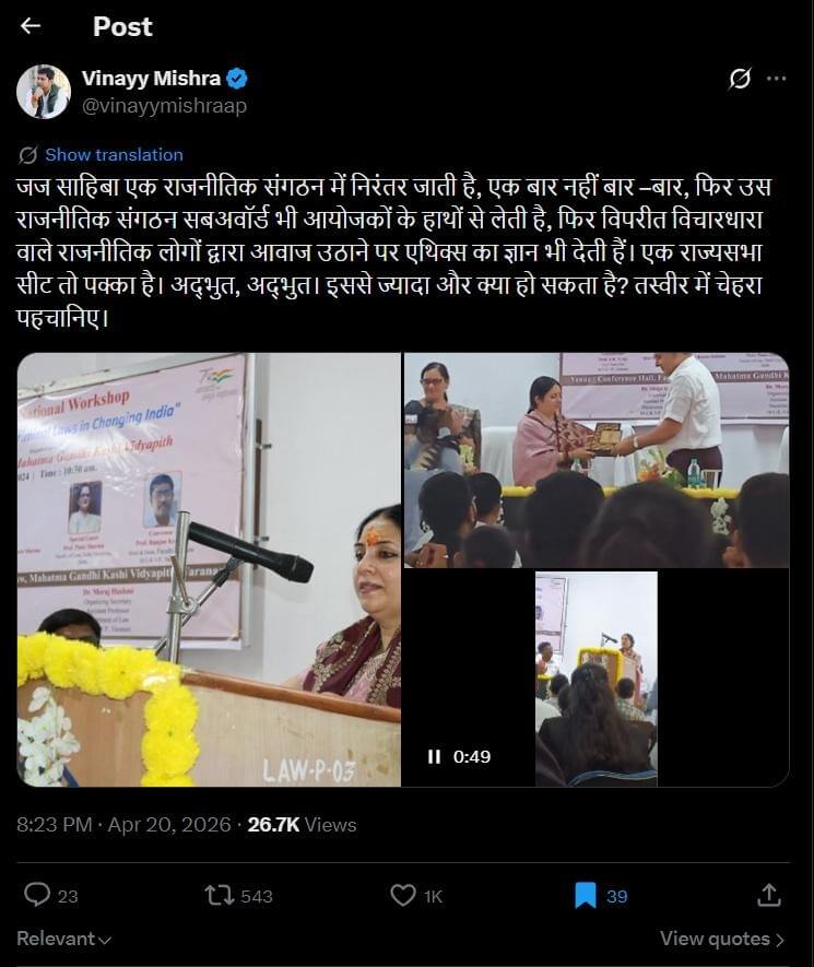 हाई कोर्ट जज शर्मा द्वारा केजरीवाल से जुड़े केस पर झटका मिलने से आप नेता बिफरे हुए हैं. विनय मिश्रा ने सोशल मीडिया पोस्ट में जज स्वर्ण कांता शर्मा के कुछ पुरानी तस्वीरें और वीडियो शेयर करते हुए लिखा, “जज साहिबा बार-बार एक राजनीतिक संगठन के कार्यक्रम में शामिल होती हैं. सिर्फ शामिल ही नहीं, बल्कि पुरस्कार अपने हाथों ग्रहण भी करती हैं. जब विरोधी विचारधारा के नेता सवाल उठाते हैं, तो उन्हें नैतिकता का पाठ पढ़ाती हैं. राज्यसभा की सीट तो मानो पक्की ही है. अद्भुत… सच में अद्भुत. आखिर और क्या चाहिए? तस्वीर में चेहरा पहचानिए.”
